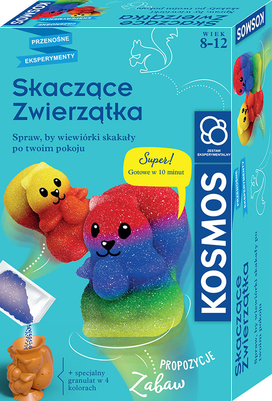 Zanurz się w świat zabawy i kreatywności z zestawem Skaczące Zwierzątka marki KOSMOS – to wyjątkowa propozycja dla dzieci od około 8 roku życia, które chcą samodzielnie stworzyć swoje kolorowe, skaczące figurki. Dzięki specjalnemu granulatowi w czterech żywych kolorach – czerwonym, zielonym, żółtym i niebieskim – oraz dwóm formom w kształcie uroczych zwierzątek, mali odkrywcy mogą połączyć naukę z ekscytującą zabawą. Wystarczy wsypać granulat do formy, dodać wodę i obserwować, jak z drobnych ziarenek powstaje elastyczna masa, która po wyschnięciu zamienia się w prawdziwie sprężyste, skaczące stworzonka.