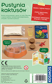 Zapraszamy do odkrywania fascynującego świata pustynnych roślin z zestawem Pustynia Kaktusów. To kompletne mini-laboratorium dla dzieci od około 6. roku życia, które dzięki niemu będą mogły we własnym pokoju stworzyć i obserwować małą pustynię ze swoim sukulentem. W pudełku znajdują się wszystkie niezbędne elementy: nasiona, doniczka-mini-szklarnia, ziemia, piasek oraz zabawna figurka jaszczurki, która doda całej scenie charakterystycznego, pustynnego klimatu.